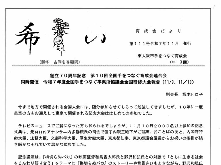 2025年(令和7年)11月、機関紙「希い(ねがい)」第111号を発行しました。 11月9日、10日に開催した、創立70周年記念 第10回全国手をつなぐ育成会連合会と令和7年度全国手をつなぐ事業所協議会全国研修大会(同時 […]
