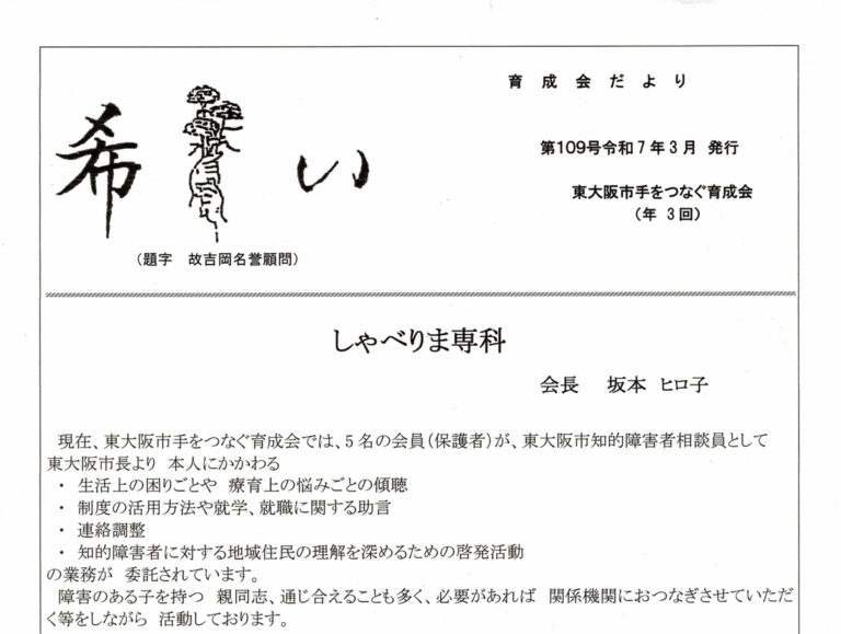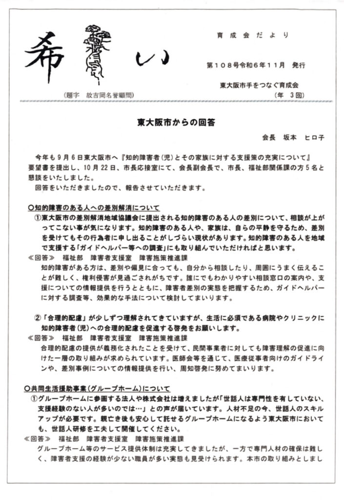 「希い」108号を発行しました 投稿日 2025年5月27日 更新日 2025年9月9日 著者 labohan カテゴリー 報告 2024年(令和6年)11月、機関紙「希い(ねがい)」第108号を発行しました。 9月6日東大阪市へ『知的障害者(児)とその家族に対する支援策の充実について』要望書を提出し、10月22日に市長、福祉部関係課の方5名と懇談をいたしました。その回答を報告しています。 また、しゃべりま専科やレクリエーション部会の行事開催の様子もレポートしています。 「希い」第108号(PDFダウンロード)